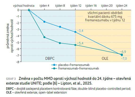 Závěry otevřené extenze studie UNITE byly prezentovány Liptonem a kol. [6] na americkém a evropském kongresu o bolestech hlavy v roce 2024. V rámci otevřené fáze byl fremanezumab aplikován pouze kvartálně (v dávce 675 mg). Sledované parametry byly totožné jako u zaslepené studie. Do otevřené extenze vstoupilo 330/353 pacientů. Průměrná změna počtu MMD oproti výchozí hodnotě byla –5,4 pro fremanezumab, –3,4 pro placebo ve 12. týdnu a –6,9 pro fremanezumab‑fremanezumab, –7,0 pro placebo‑fremanezumab ve 24. týdnu (graf 3) [6]. Snížení skóre HAM‑D 17 činilo –6,8 a –5,4 ve 12. týdnu a –7,6 a –8,4 ve 24. týdnu pro skupiny fremanezumab‑fremanezumab a placebo‑fremanezumab. Klinicky významné snížení skóre HIT‑6, CGI‑S a PHQ‑9 bylo pozorováno ve 24. týdnu v obou léčebných skupinách. Celkem 60 (18 %) pacientů hlásilo jeden nebo více nežádoucích účinků.